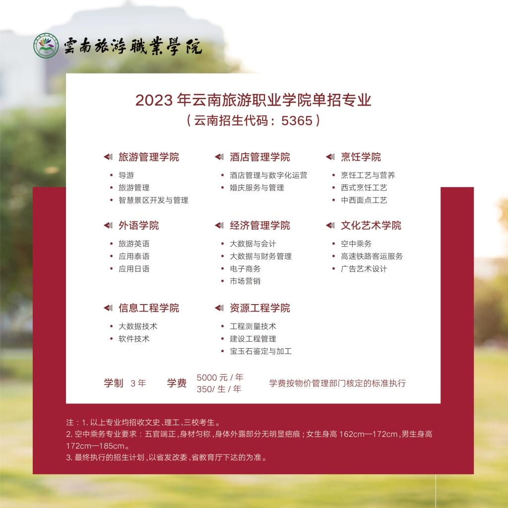 云南旅游职业学院2023年单独招生简章